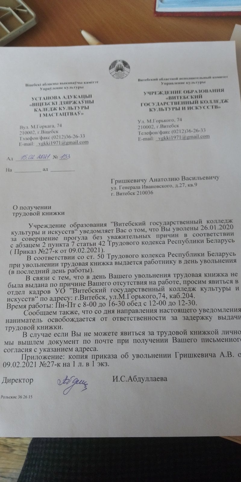 Сённяшняе паведамленне ў пэўным сэнсе можна лічыць канчатковым адказам Віцебскага каледжа культуры і мастацтваў на заяву рэжысёра. Толькі, як заўважыў ужо не адзін карыстальнік сацсеткі, загад аб звальненні педагога аформлены заднім днём. (Звольнены Антон Грышкевіч 26 студзеня, а загад датуецца 9 лютым 2021-га).