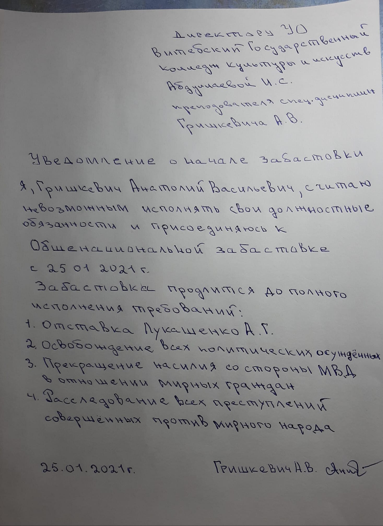 Нагадаем, што Антон Грышкевіч страйкуе ўжо 22 дні, з 25 студзеня, калі ён аб’явіў аб сваёй пазіцыі ў сеціве. Рэжысёр зрабіў відэазварот, у якім агучыў свае патрабаванні, а таксама сфатаграфаваў заяву, што занёс у прыёмную каледжа менавіта 25 студзеня.