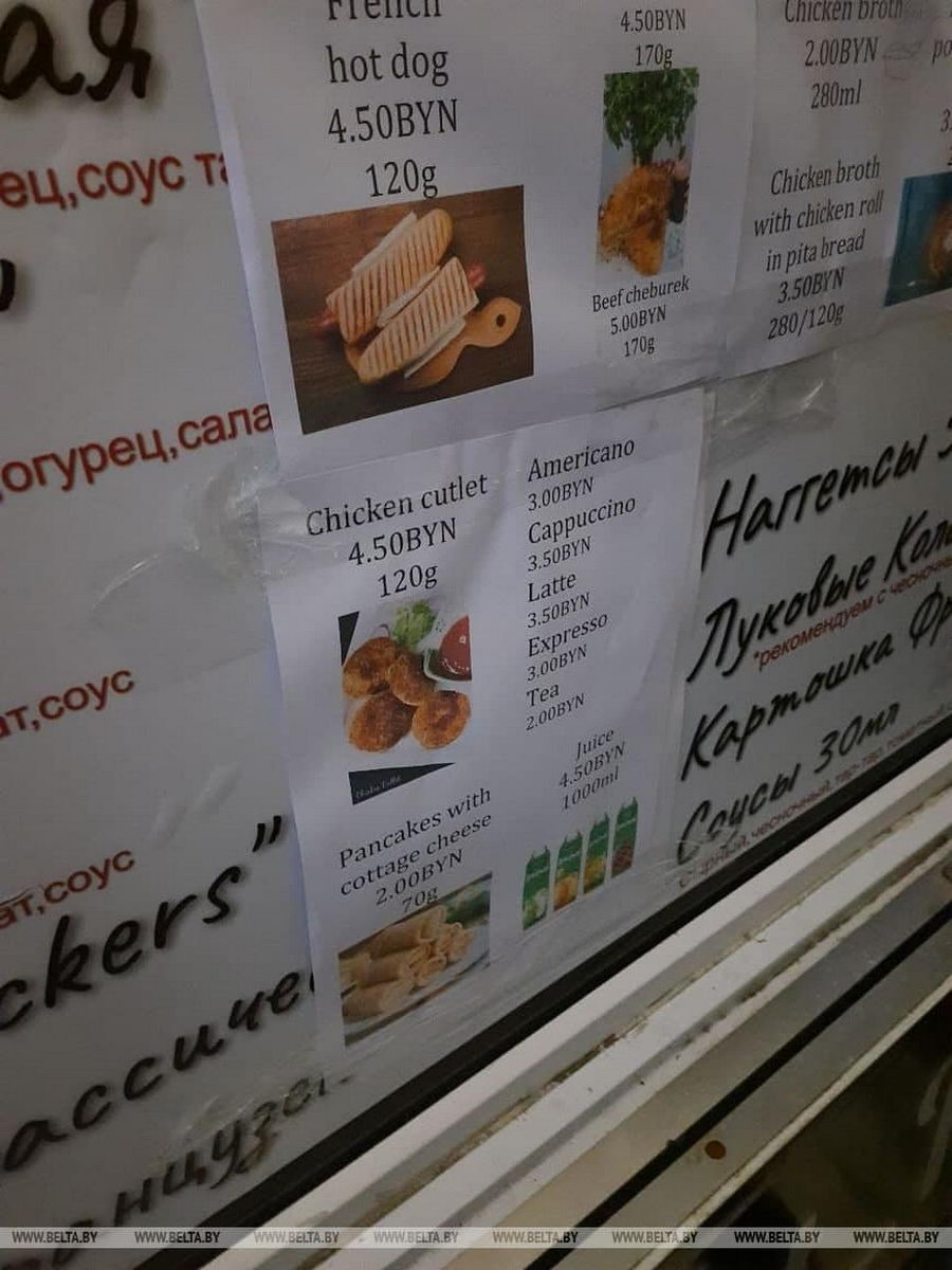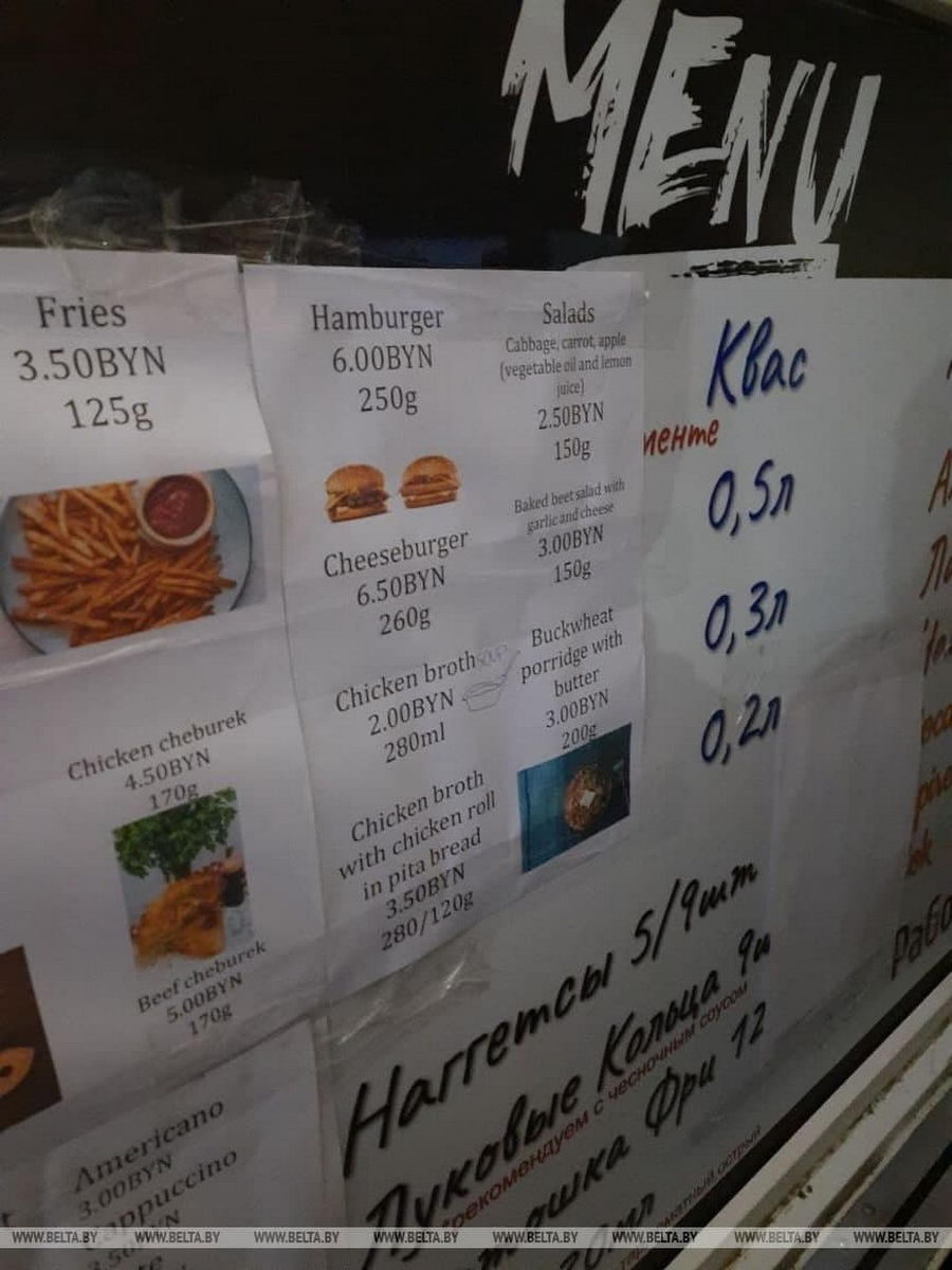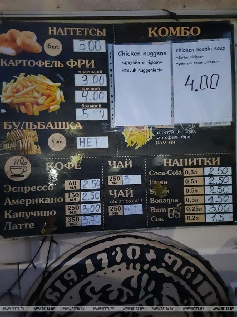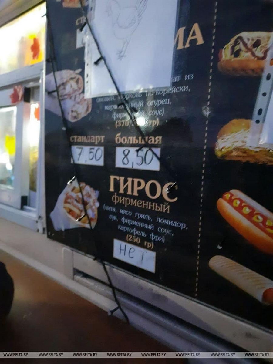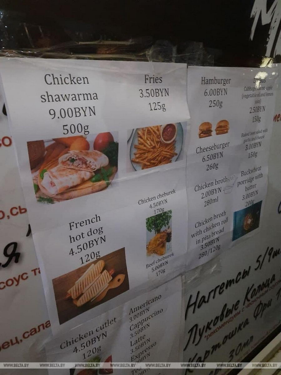К слову, сегодня к ТЛЦ прибыл еще один фудтрак — с шаурмой, бургерами и наггетсами. БелТА опубликовала фото цен на товары в новой торговой точке. По информации на 15:58, цена на шаурму стандартного размера составляла 7,5 рублей, а большого — 8,5.