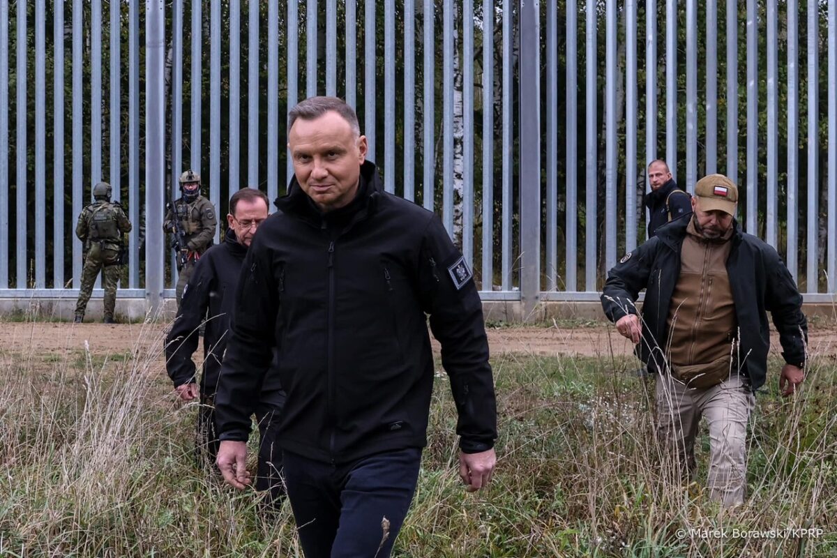 Президент Польши Анджей Дуда и министр иностранных дел Мариуш Каминьски приехали на польско-беларусскую границу, где встретились с пограничниками, полицейскими и солдатами.