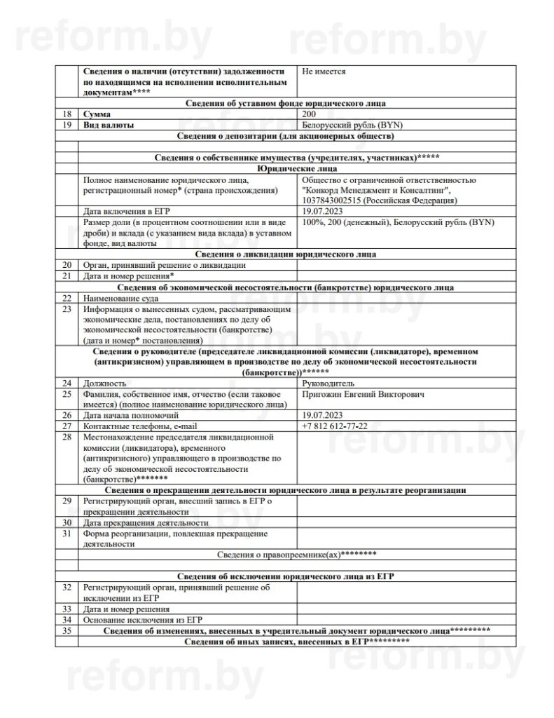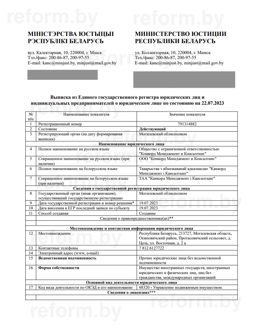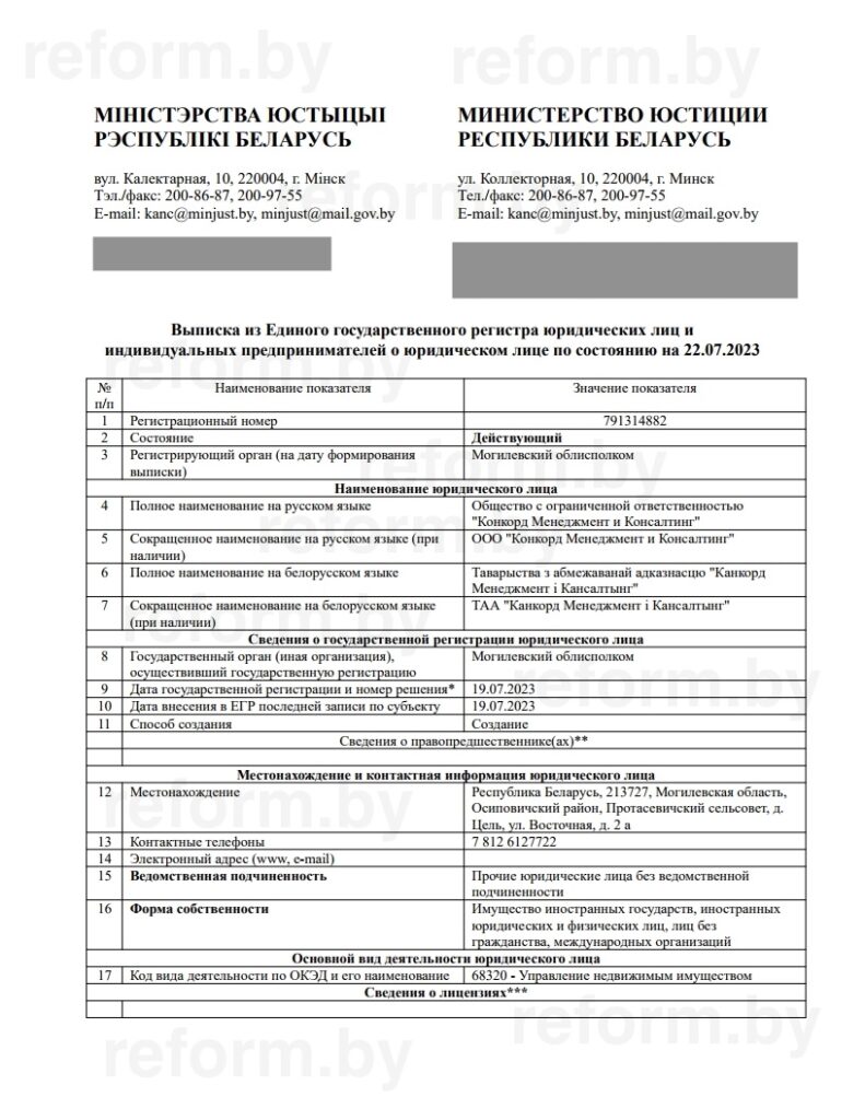 По информации Reform.by, общество с ограниченной ответственностью «Конкорд Менеджмент и Консалтинг» с уставным фондом в 200 беларусских рублей (около 80 долларов) было зарегистрировано Могилевским облисполкомом 19 июля 2023 года и получило УНП 791314882.