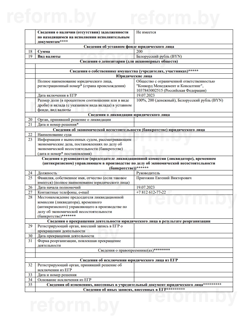 100%-й владелец беларусской компании — российское ООО «Конкорд Менеджмент и Консалтинг» (1037843002515), а «руководителем» указан Пригожин Евгений Викторович. С ним можно связаться по телефону +7 812 612-77-22.