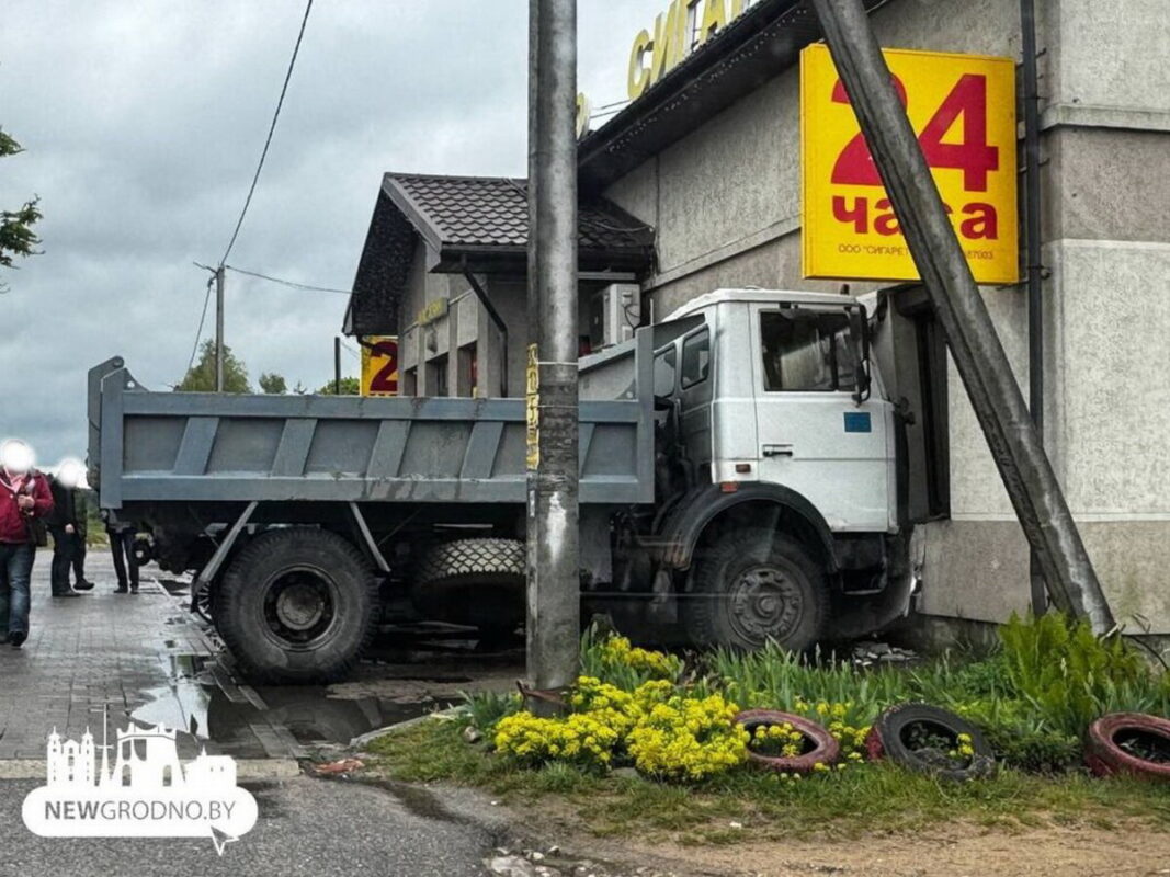 МАЗ врезался в стену продуктового магазина на улице Суворова на въезде в Гродно, пишет NewGrodno.by. Водитель получил незначительные повреждения, его забрала «скорая».