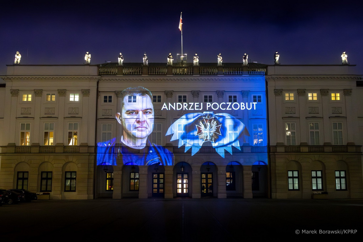 На президентском дворце в Варшаве появилась проекция фотографии политзаключенного журналиста Анджея Почобута. Снимок опубликовала канцелярия президента Польши.