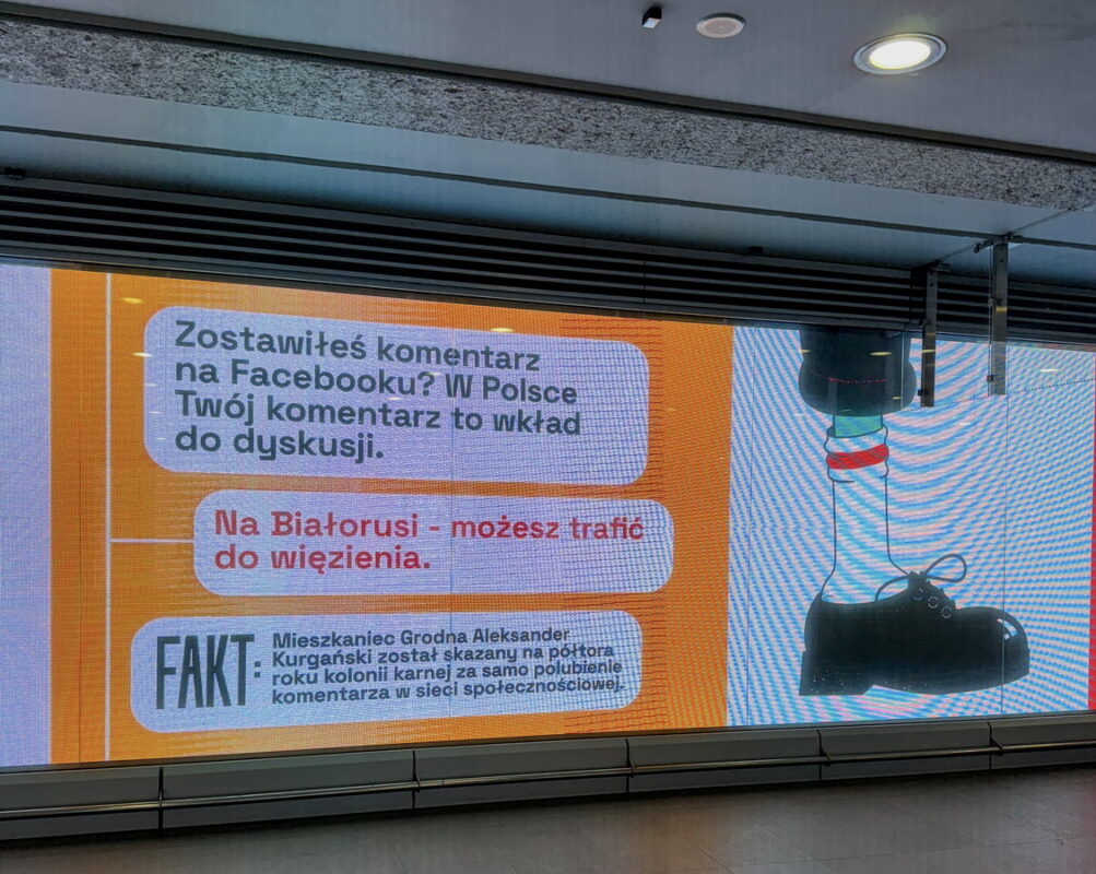 На рекламных экранах Варшавы появились изображения о репрессиях в Беларуси. «Оставил комментарий в Facebook? В Польше ваш комментарий — вклад в дискуссию. В Беларуси можешь попасть в тюрьму», — такой текст фигурирует в сообщениях.