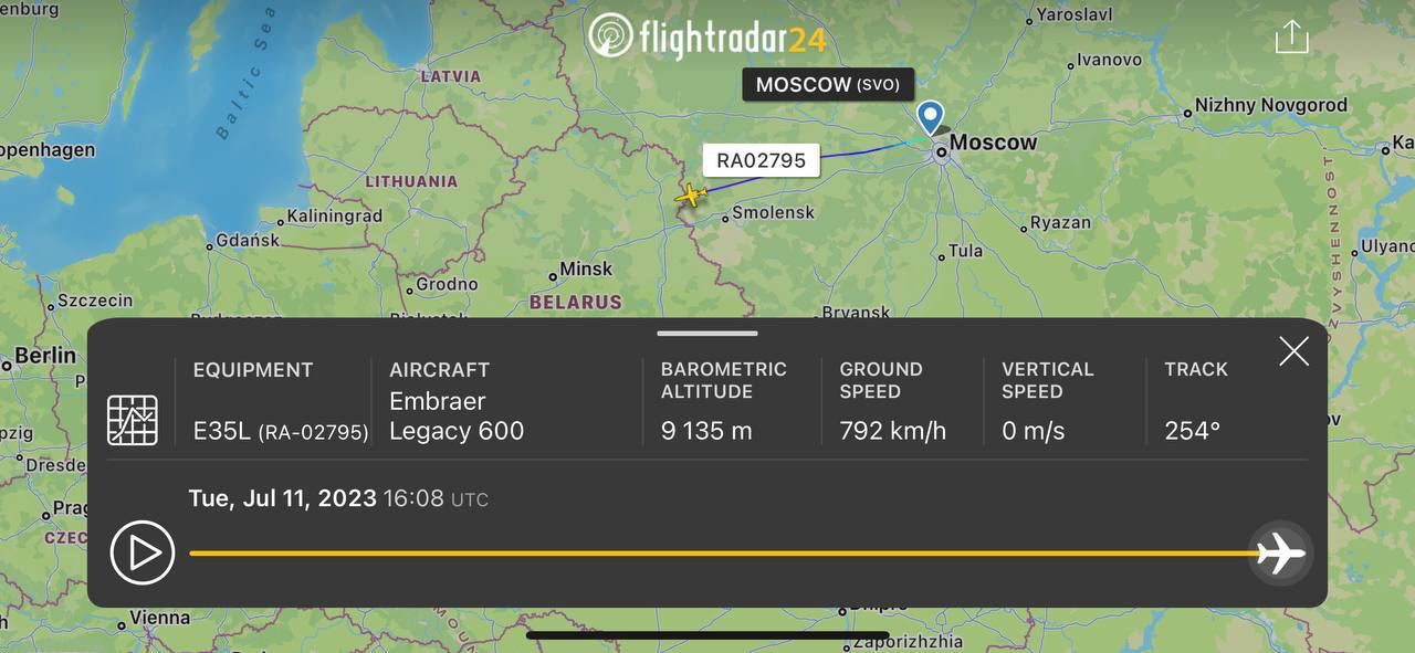 Самолет Евгения Пригожина Embraer Legacy 600 (рег. номер RA-02795) снова прилетел в Беларусь, сообщает мониторинговая группа «Беларускi Гаюн».