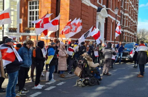 У посольства Беларуси в Лондоне прошла акция протеста. Участники принесли с собой национальные бело-красно-белые