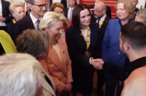 Светлана Тихановская и Владимир Зеленский обменялись рукопожатиями на вручении премии Карла Великого