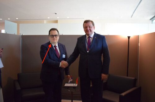 Министр иностранных дел Сергей Алейник пожал руку советнику Светланы Тихановской Франаку Вячорке на полях