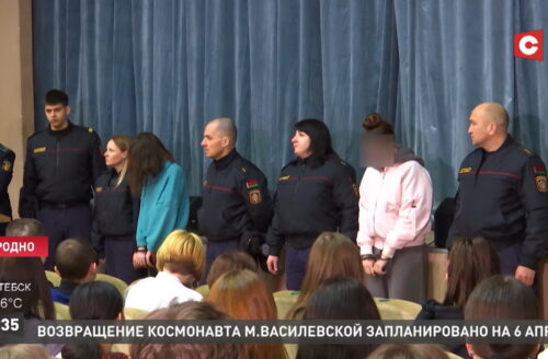 Двух девушек показательно взяли под стражу перед учащимися колледжа за поджог флага в Гродно, сообщают