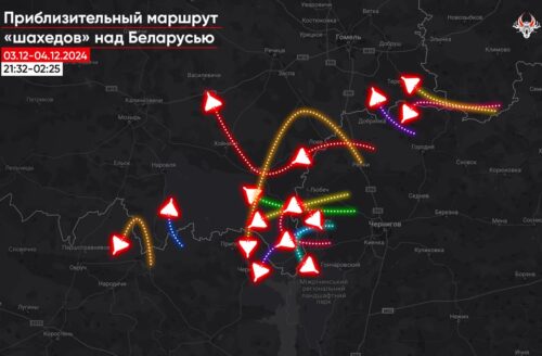 В ночь с 3 на 4 декабря в Беларусь зашло не менее 15 российских дронов-камикадзе типа «шахед», сообщает